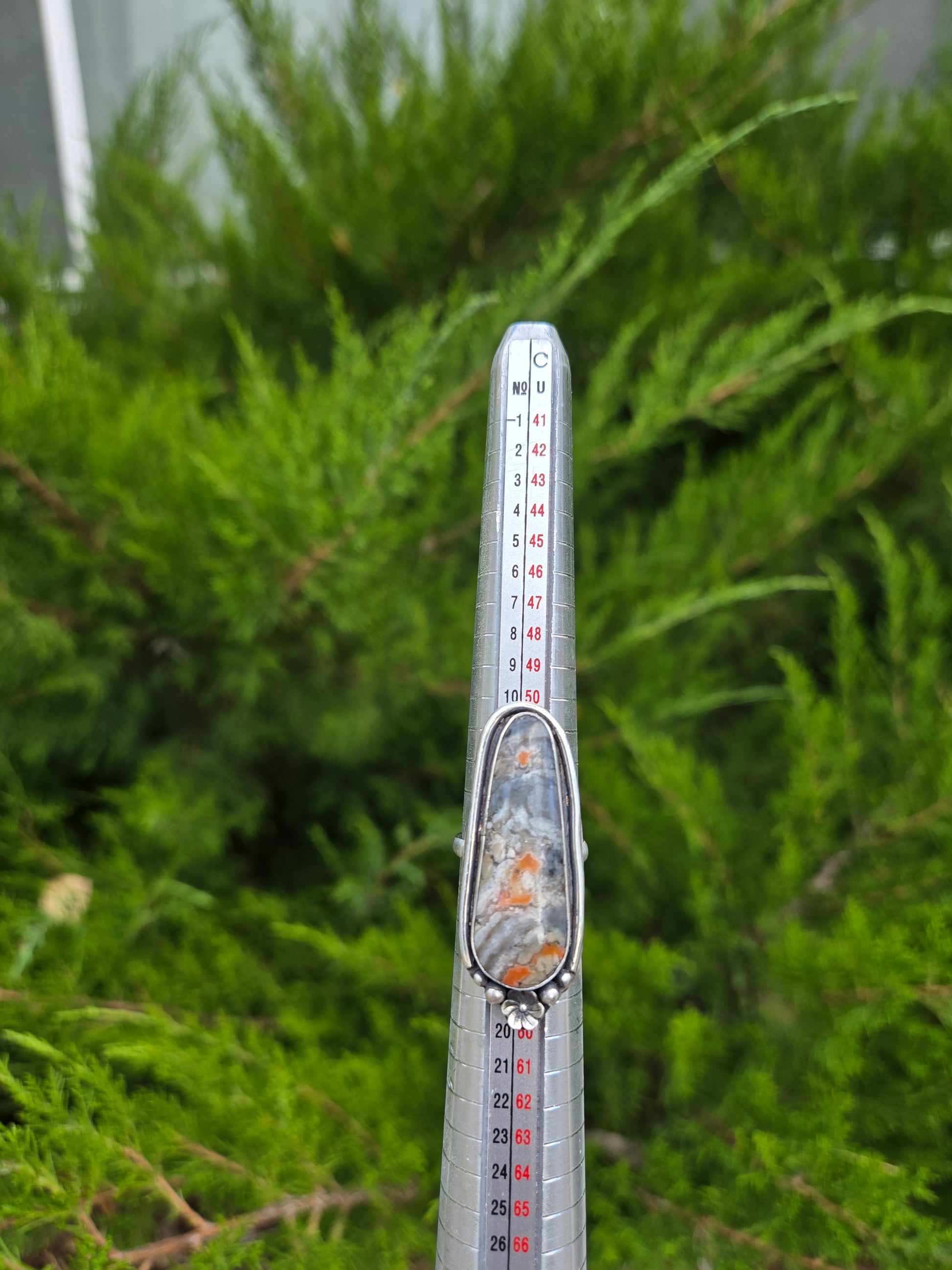I am OBSESSED with this stone. As soon as I saw it, I instantly bought it. It sits above four silver balls with the cutest flower in the center. It small shadowbox design allows for the stone to pop even more. The shades of blue and orange will make it a standout piece in your collection!